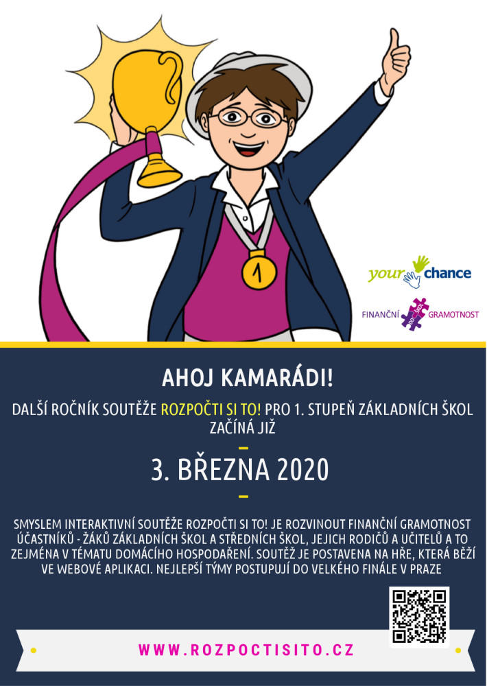 Interaktivní soutěž Rozpočti si to! zahájila v úterý 3. 3. 2020 svůj 7. ročník v kategorii 1. stupeň základních škol. Pořadatelem je společnost yourchance a její projekt Finanční gramotnost do škol. Hra prověřuje finanční gramotnost na českých školách a každoročně se jí účastní přes tisíc žáků základních a středních škol. Přidejte se letos také Vy!