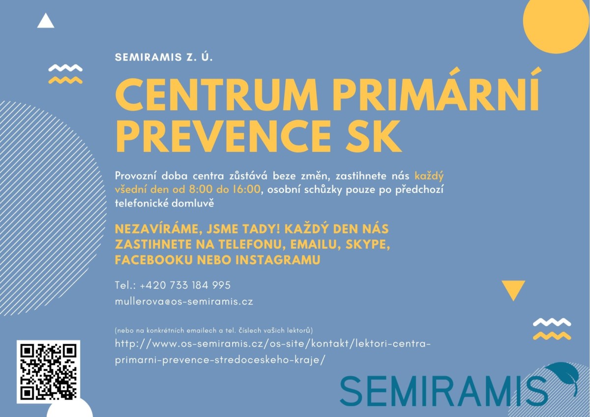 Sdílíme informace organizace Semiramis, které měly původně zaznít na plánovaném setkání školních metodiků prevence Středočeského kraje (12. 5. 2020). Vše naleznete v přiložených souborech ve formě prezentace a balíčku. V prezentaci jsou shrnuty všechny důležité informace, které by jinak zazněly i na setkání. V balíčku pak dokumenty, které jsou v prezentaci zmíněny, např.: