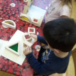 Dřevěné tvary – čtverec, obdelník, trojúhelník, polokruh – průsvitný vnitřek vyplněný materiály různých barev a hrubosti.