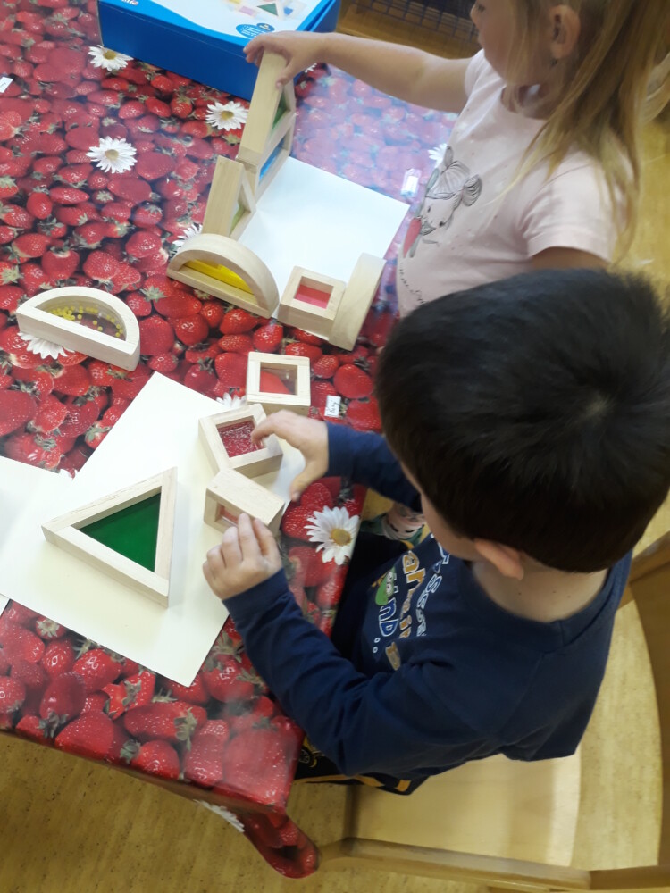 Dřevěné tvary – čtverec, obdelník, trojúhelník, polokruh – průsvitný vnitřek vyplněný materiály různých barev a hrubosti.